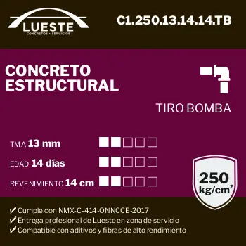 Concreto Estructural Clase 1, FC = 250, TMA = 13, Edad = ART 14 al 80%, Rev = 14, Tiro = Bombeo